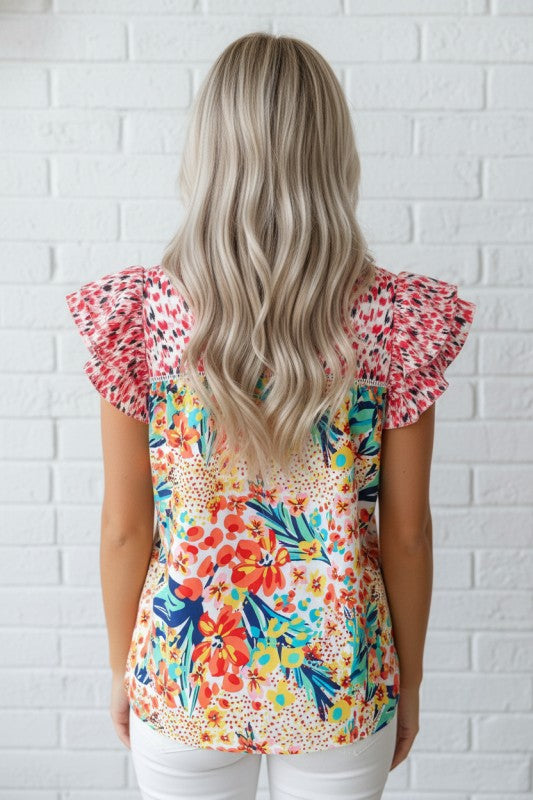 Floral Patchwork Ruffle Cap Sleeve Blouse