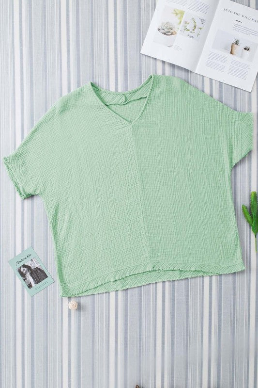 Frayed Batwing-Sleeve Textured Cotton Blouse