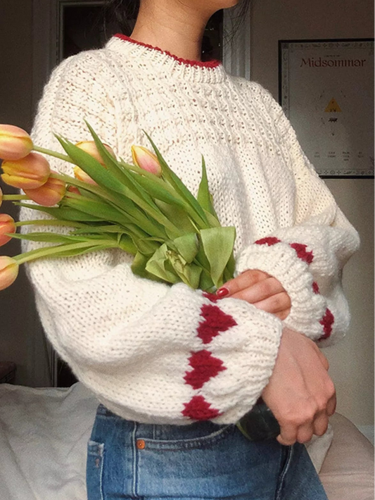 Balloon Sleeve Oversized Ribbed Top with Floral Pattern Contrast