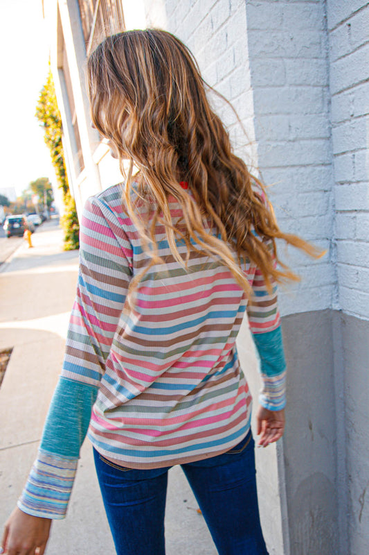 Coral Taupe Multistrip Rib Out Seam Detail Top