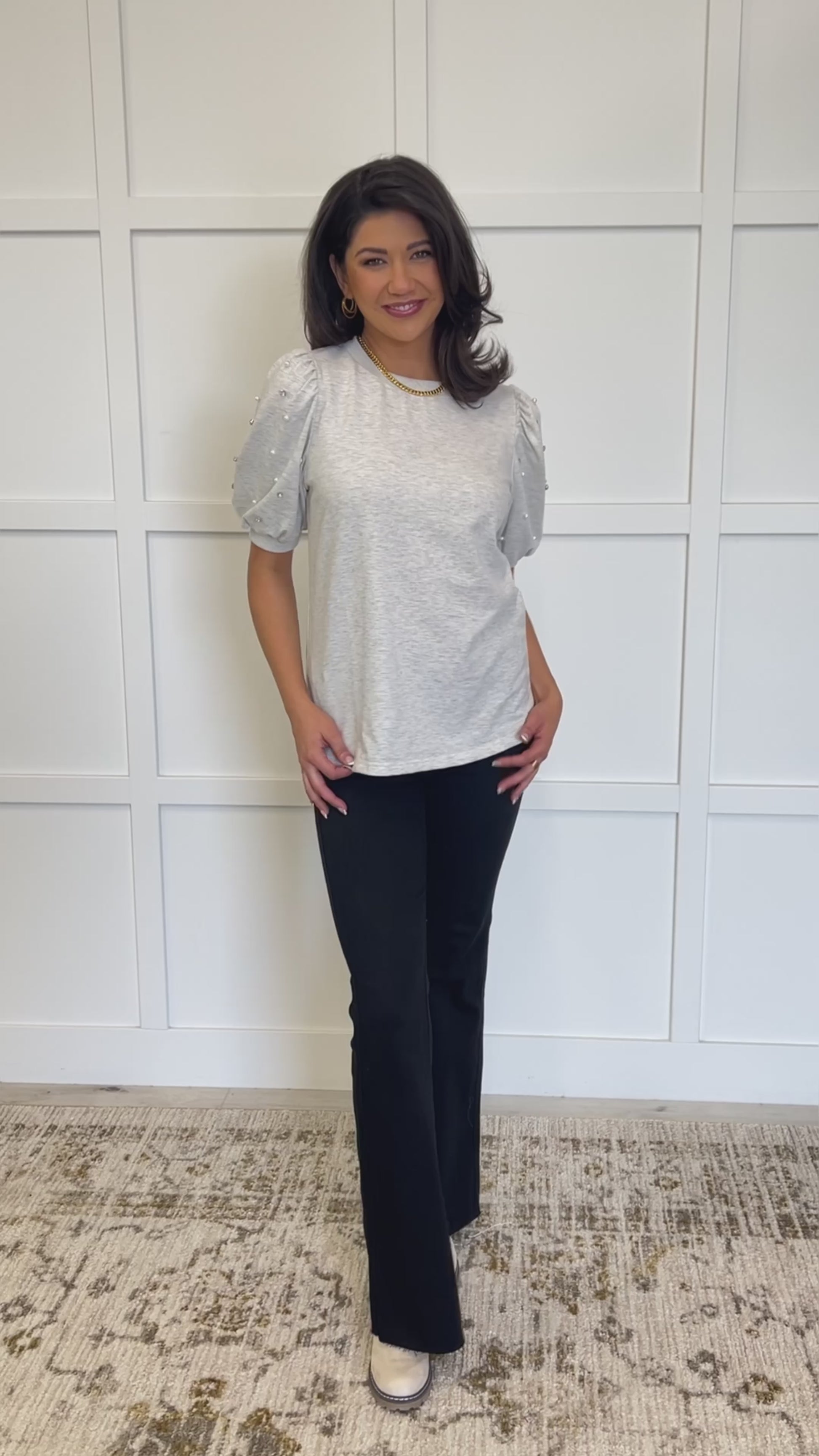 Slay in style with our Diamonds and Pearls Puff Sleeve Top in Light Grey! Made from luxurious French terry fabric, this top features a banded ribbed neckline and chic balloon sleeves adorned with pearl and faux diamond accents. Finished with a banded ribbed sleeve cuff, it's both comfortable and glamorous.