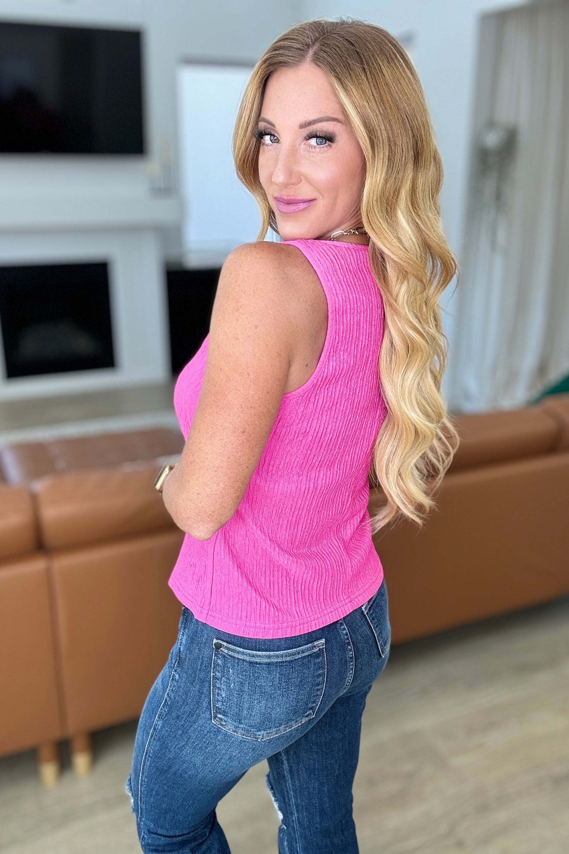 Don't fret! Our Not A Worry Textured Tank has got your back (and front)! Made with high stretch crinkle poly for the perfect layering piece. And a scoop neck for a flattering fit. Go ahead, add it to your wardrobe. You won't regret it!